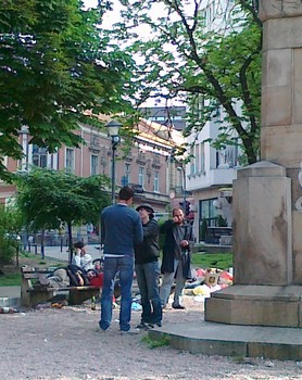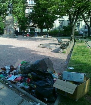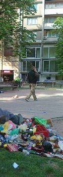 Jutros je park izgledao kao deponija. Ta količina otpada nije neobična ako je 2000 ljudi na tom malom prostoru popilo bar po jedno pivo. Ipak izgleda da je pića bilo mnogo više po glavi protestanta, a neprihvatljivo da nisu mogli da ambalažu ubacuju u kontejnere kojih ima na samoj ivici parka bar tri, a potpuno je zapanjujuće da je park pun srče-razbijenog stakla. Očiledno je da protestanti nisu mogli dostojanstveno i mirno da podnesu toluku količinu alkohola. Neki od njih su se, ili su to stalni gosti ovog parka, pijano teturali u 8 ujutru, puštali neartikulisane glasove i dalje razbacivali ambalažu, koju je jedan radnik gradske komunalne službe skupljao na nekoliko gomila da bi ih kasnije, kako je objasnio, pokupio KAMION. Policijska trojka je nezainteresovano posmatrala. Verovatno nije njihov resor.