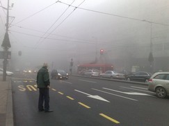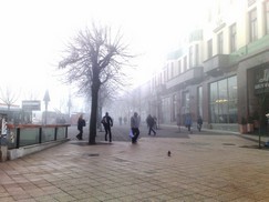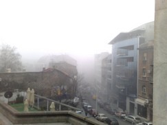 Jutros, sasvim neočekivano, nešto oko 9h, magla se popela na Terazije, zaklonila Palatu Albaniju, Hotel Moskvu, na vidiku nije bilo ni Beogradjanke, Skupštine, a Balkanska ulica se jedva nazirala. Ništa nije izgledalo kao na razglednicama Beograda, ni starim ni onim ovovremenskim.